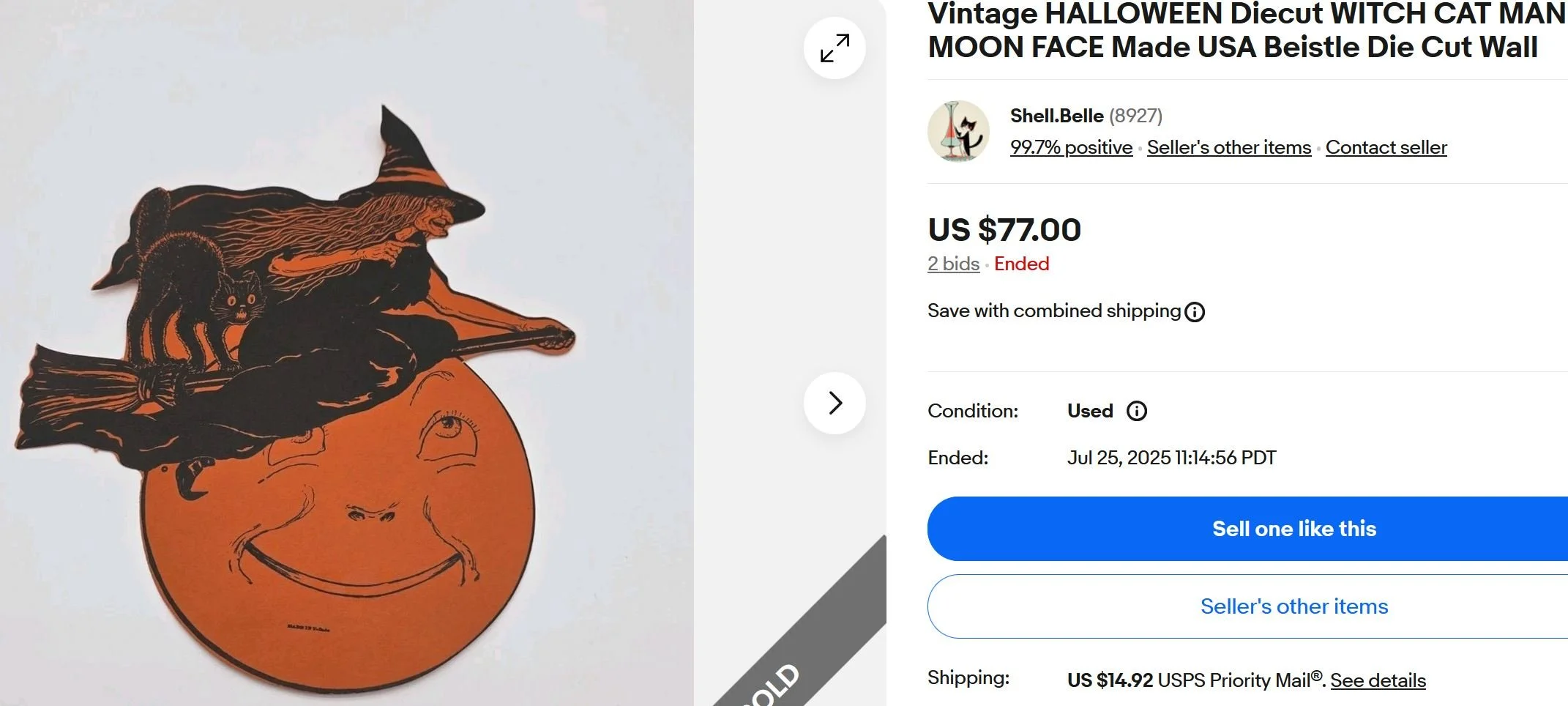 Interest has been strong in these non-embossed thin-paper-stock diecuts Beistle produced during the early 1920s.Beistle produced a handful of designs, then varied their offerings by size. This is the larger version of the broomed witch diecut. These diecuts bend and crease easily. The typical example is riddled with pinholes. This particular example seems quite crisp, so I’m not surprised the prevailing bidder paid $77. I do hope the bidder objected to it being sent Priority Mail. There isn’t any reason to send something that weighs an ounce or two via Priority Mail. On another note, I dislike when sellers cram a series of disjointed words into the title line hoping the search function will highlight the listing.