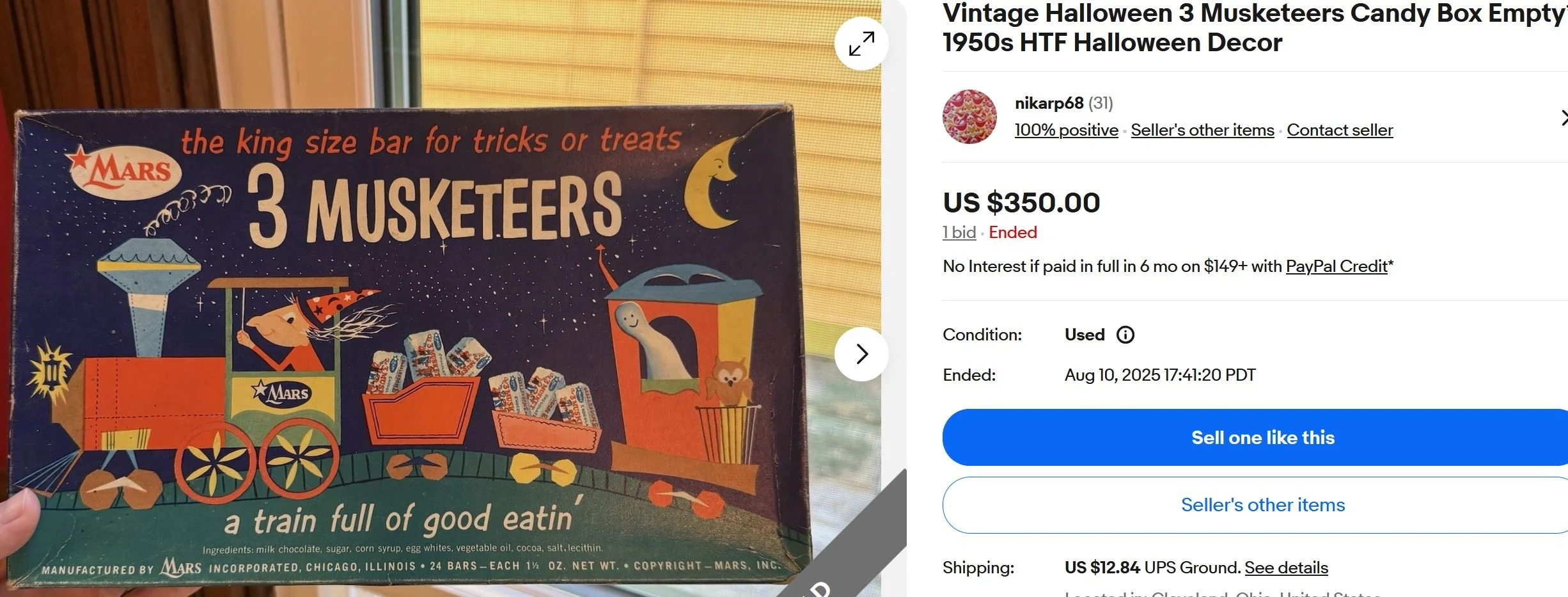 Retail candy boxes from the bigger brands in the candy world is a hot market segment. Even examples like this beat-up Milky Way box has been bid up to $81 with over three days left. Perhaps 18+ months ago, something in this condition would have prompted only yawns, not bids.